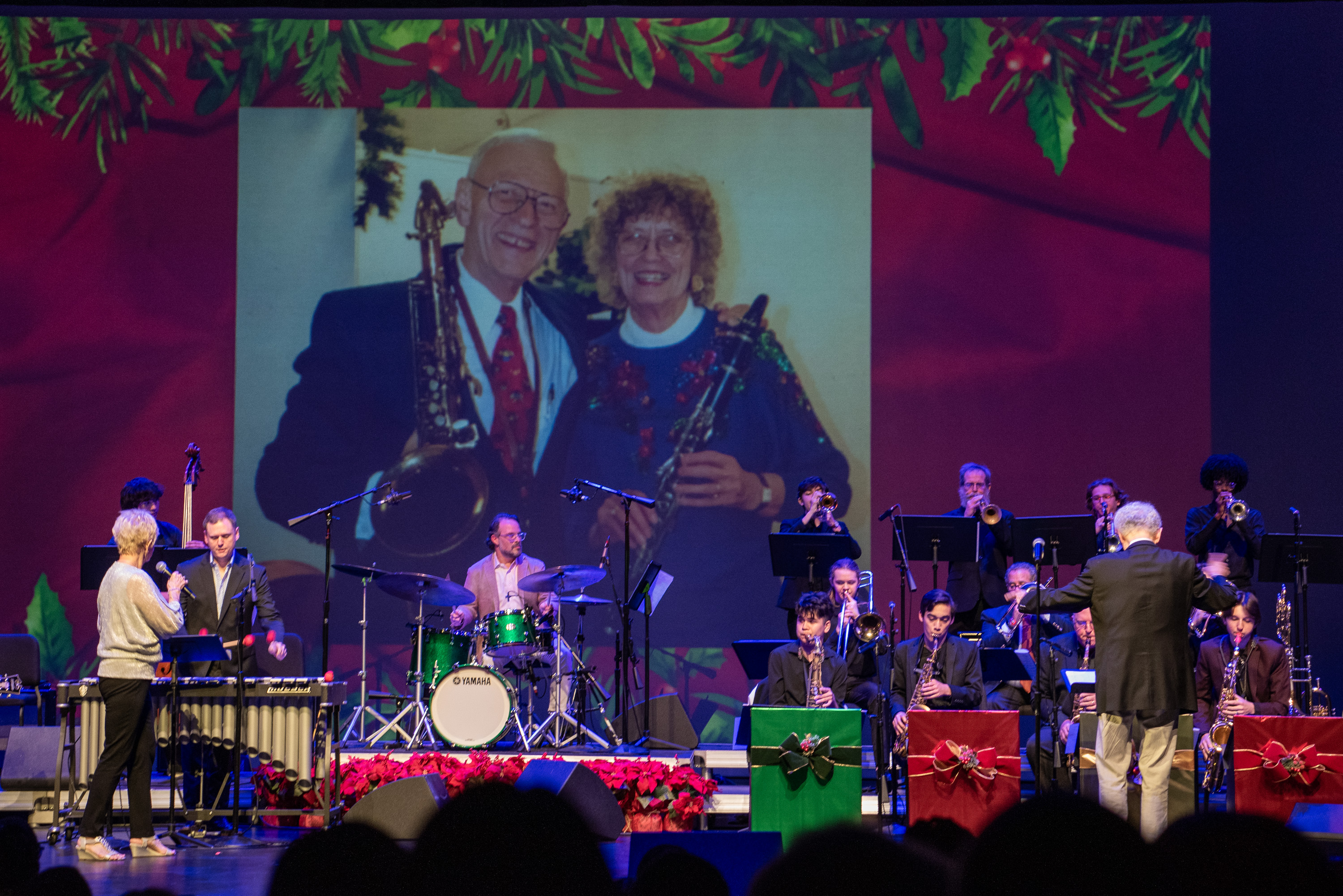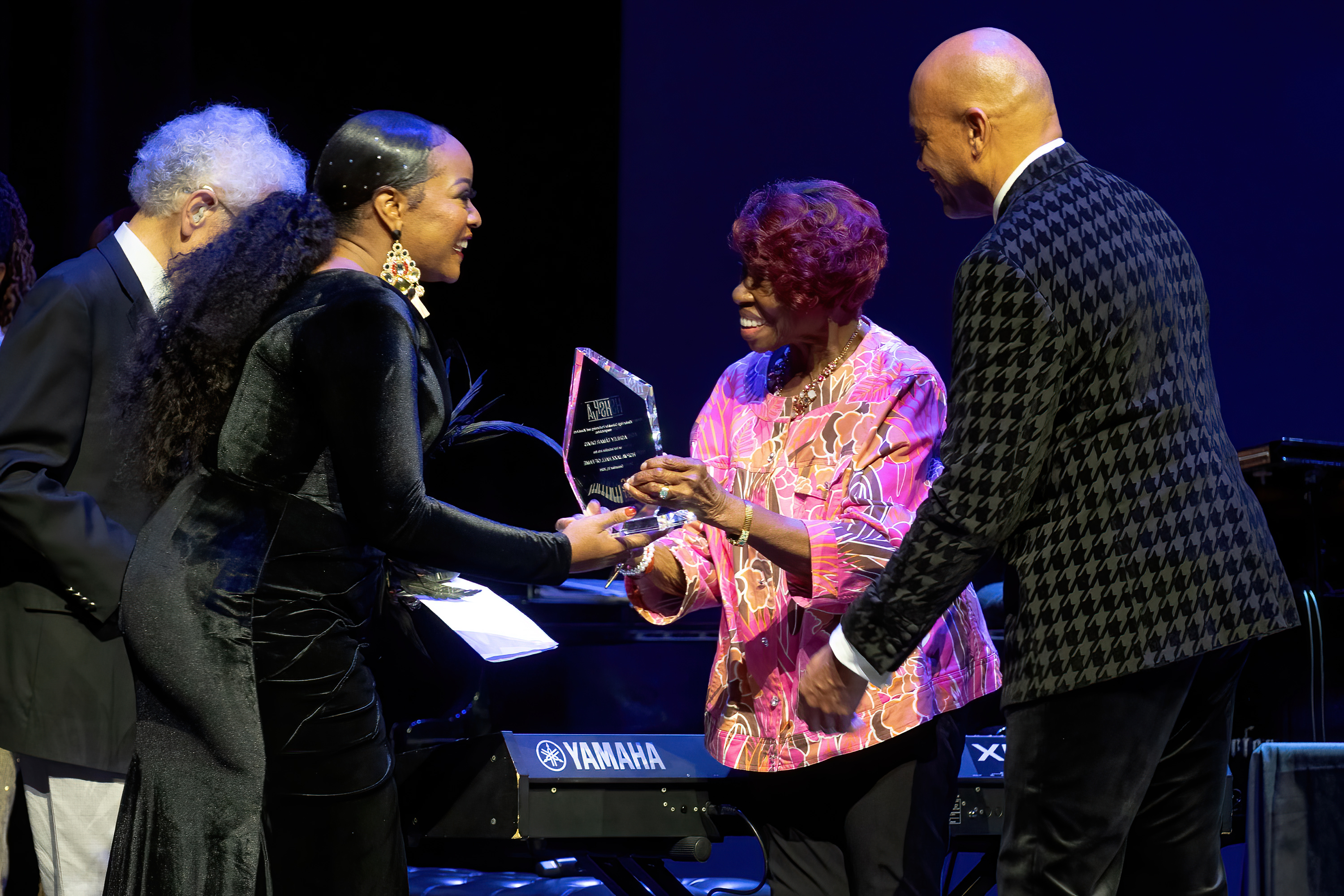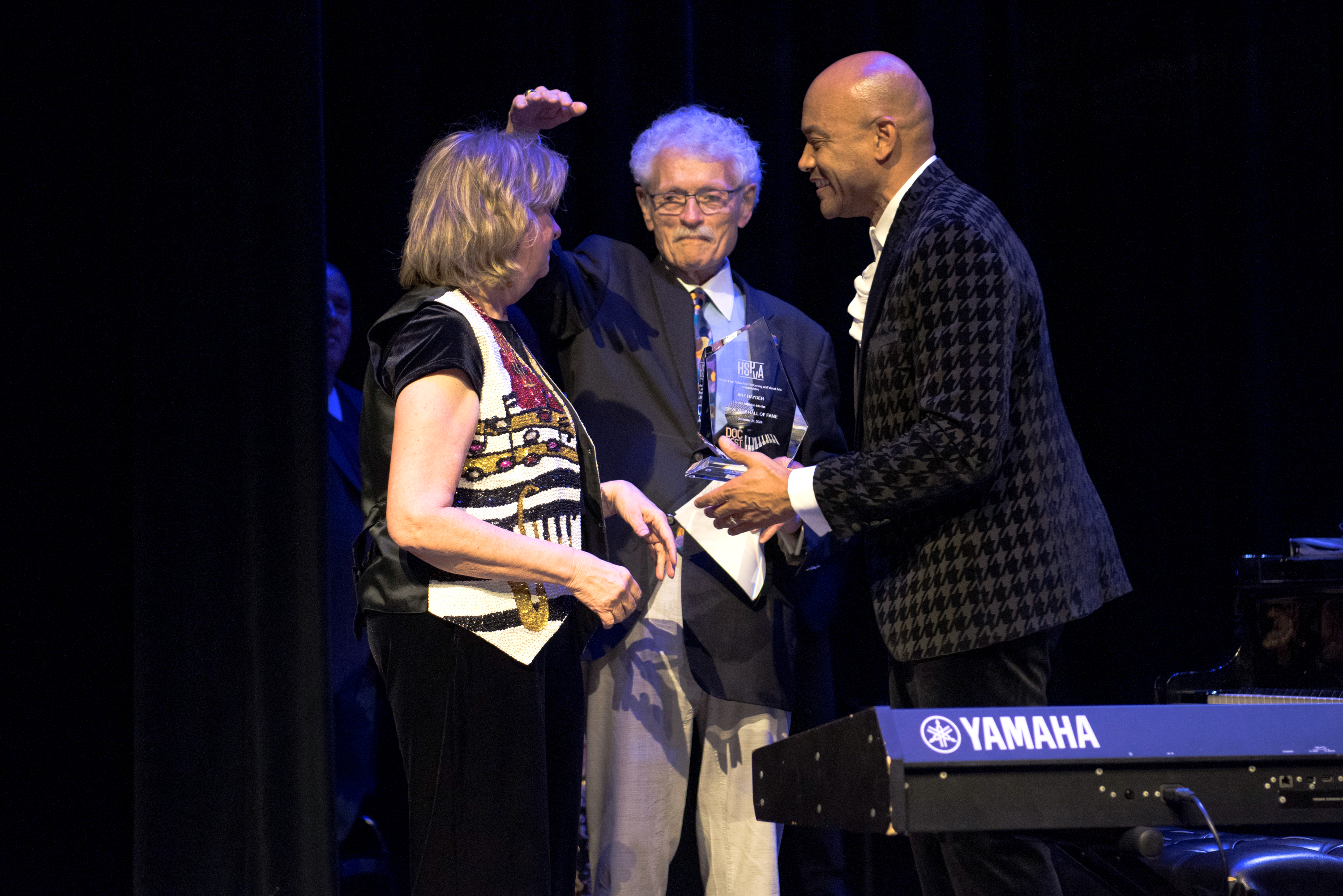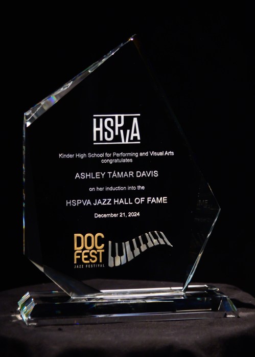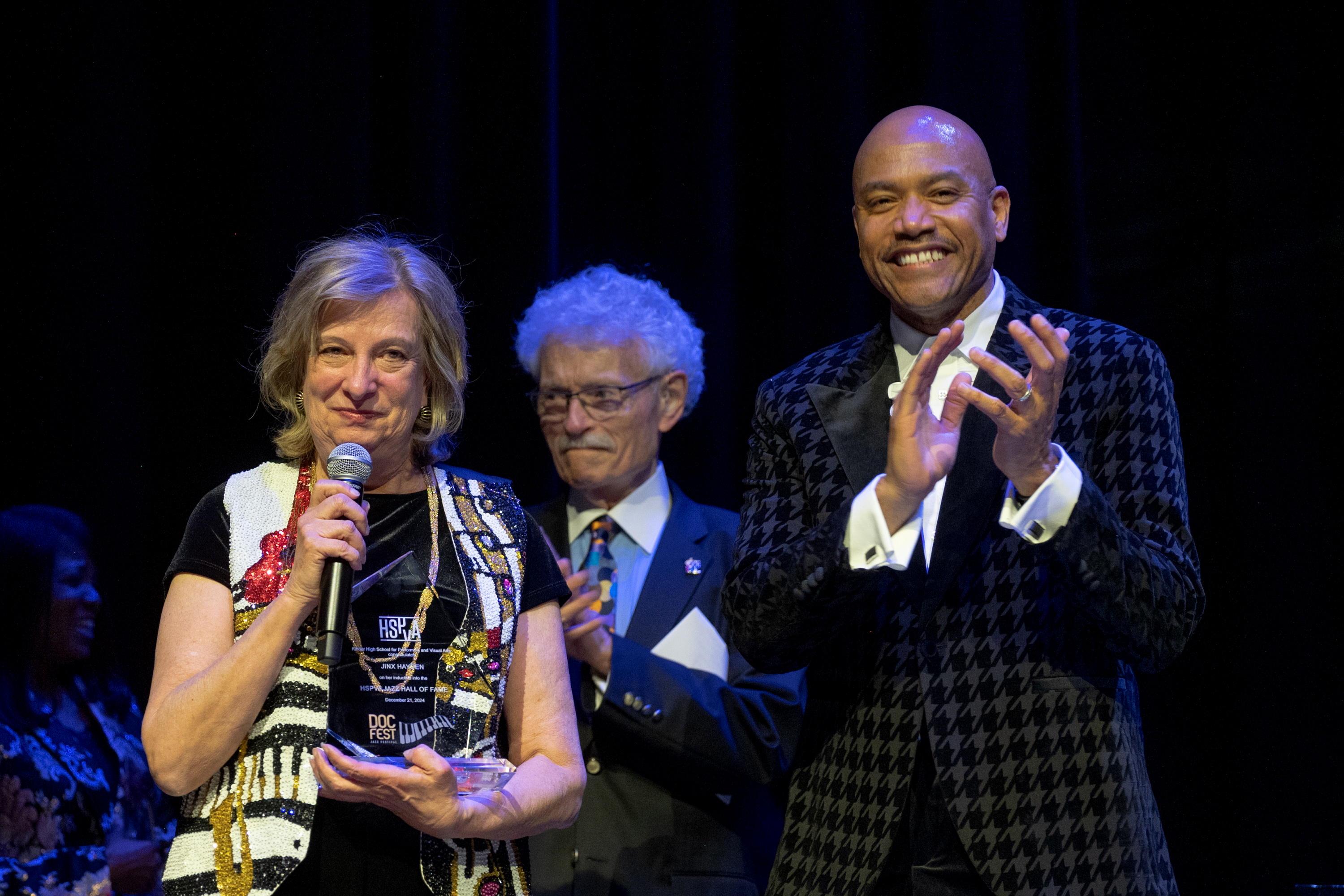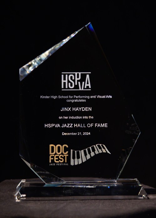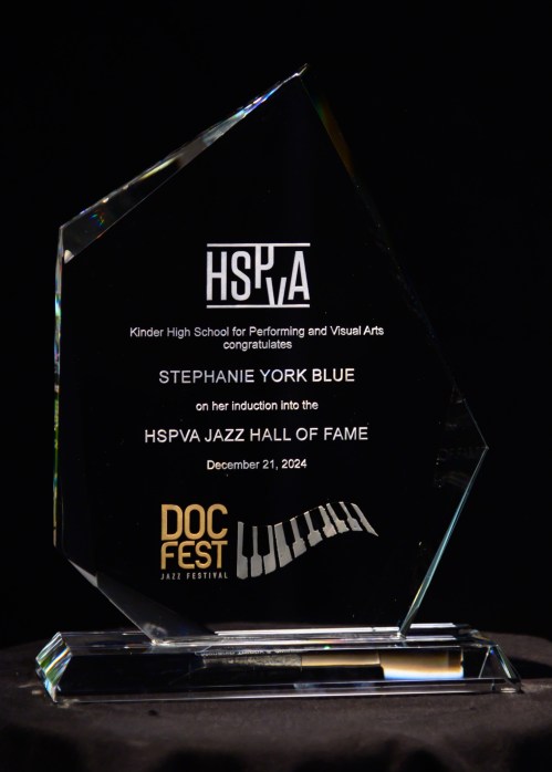 Featured artists and DocFest co-founders Ashley Tamar Davis and Chris Walker performed a selection of original tunes and holiday favorites, accompanied by the “DocFest All-Star Band” rhythm section. For the grand finale, the entire cast joined together for a performance of “This Christmas.” A major highlight of the evening was the induction of Stephanie York Blue and Ashley Tamar Davis into the HSPVA Jazz Hall of Fame. Additionally, Doc Morgan presented Jinx Hayden with an honorary induction into the Hall of Fame in recognition of her extraordinary contributions to DocFest.