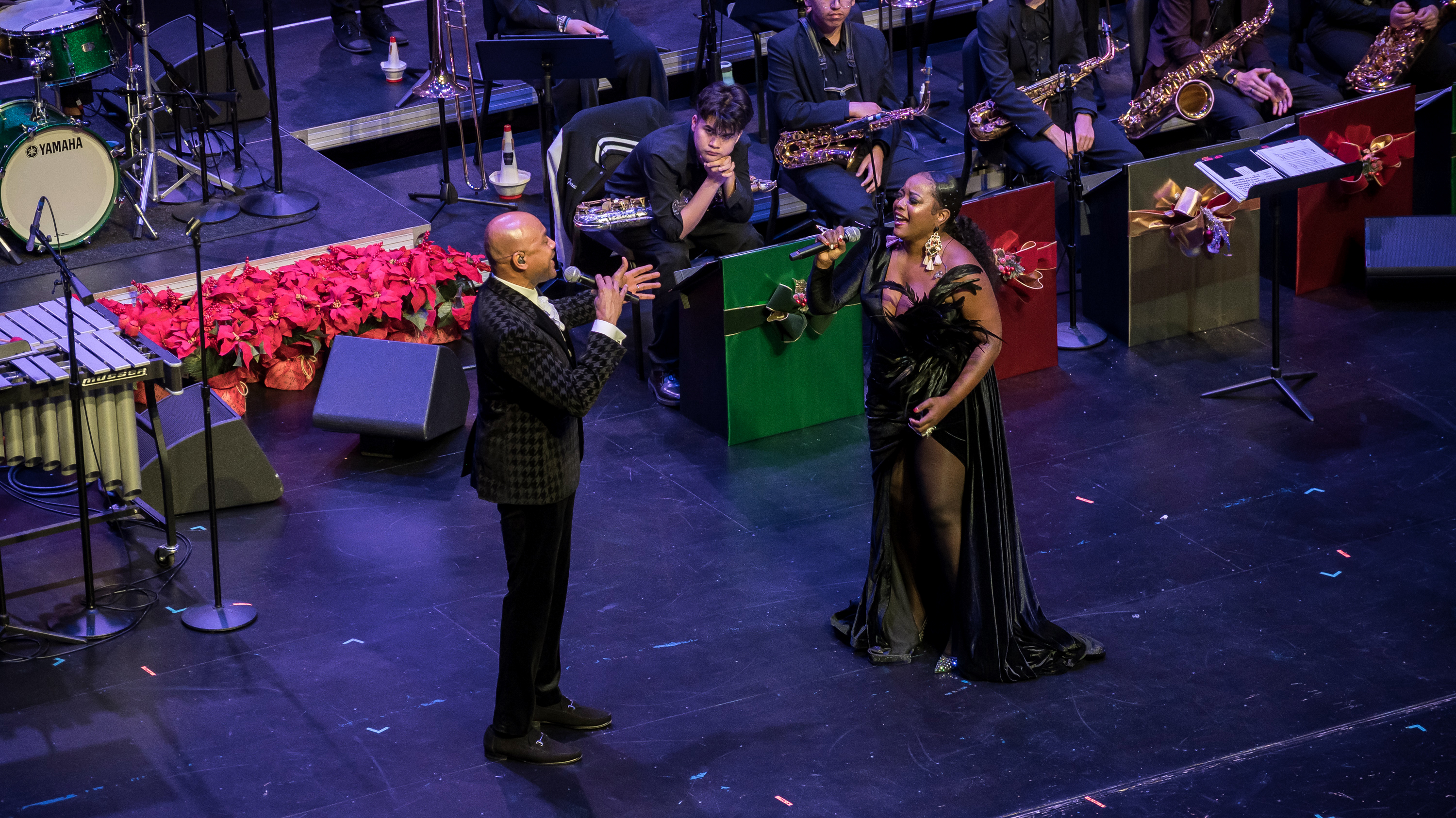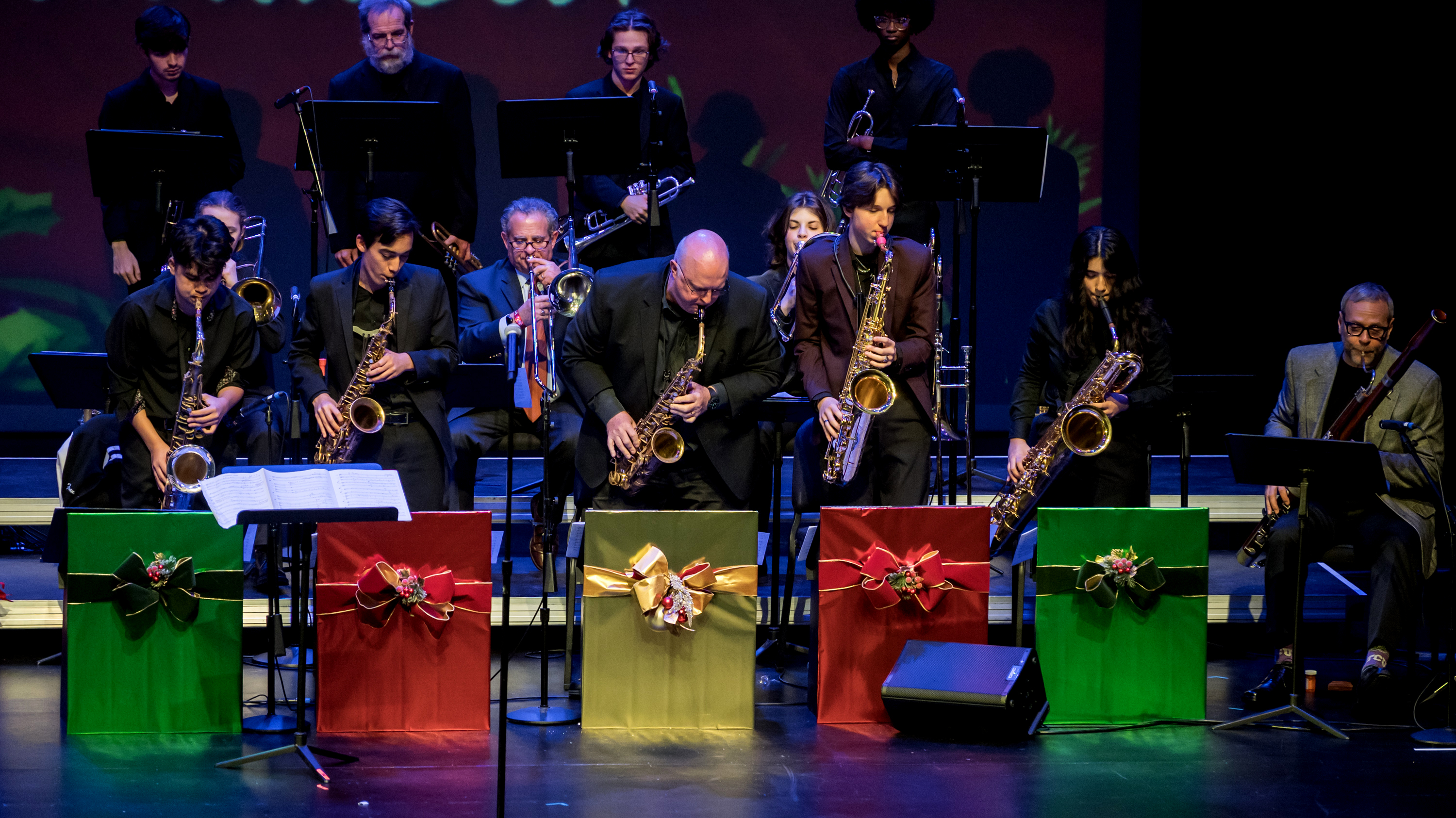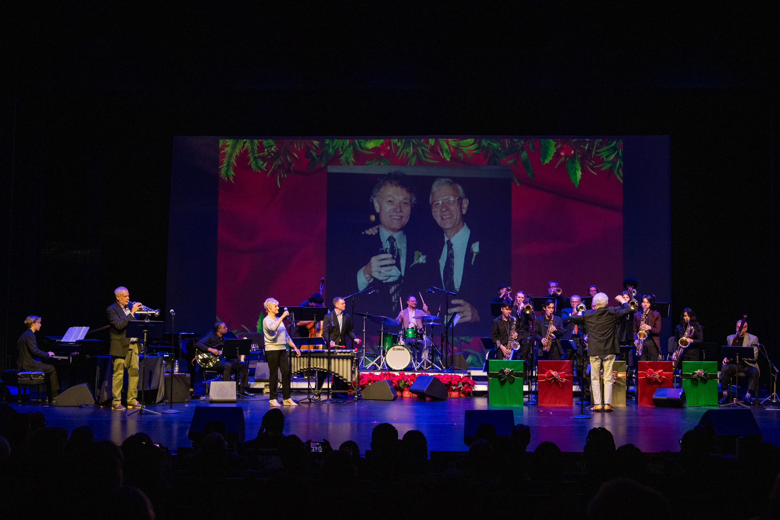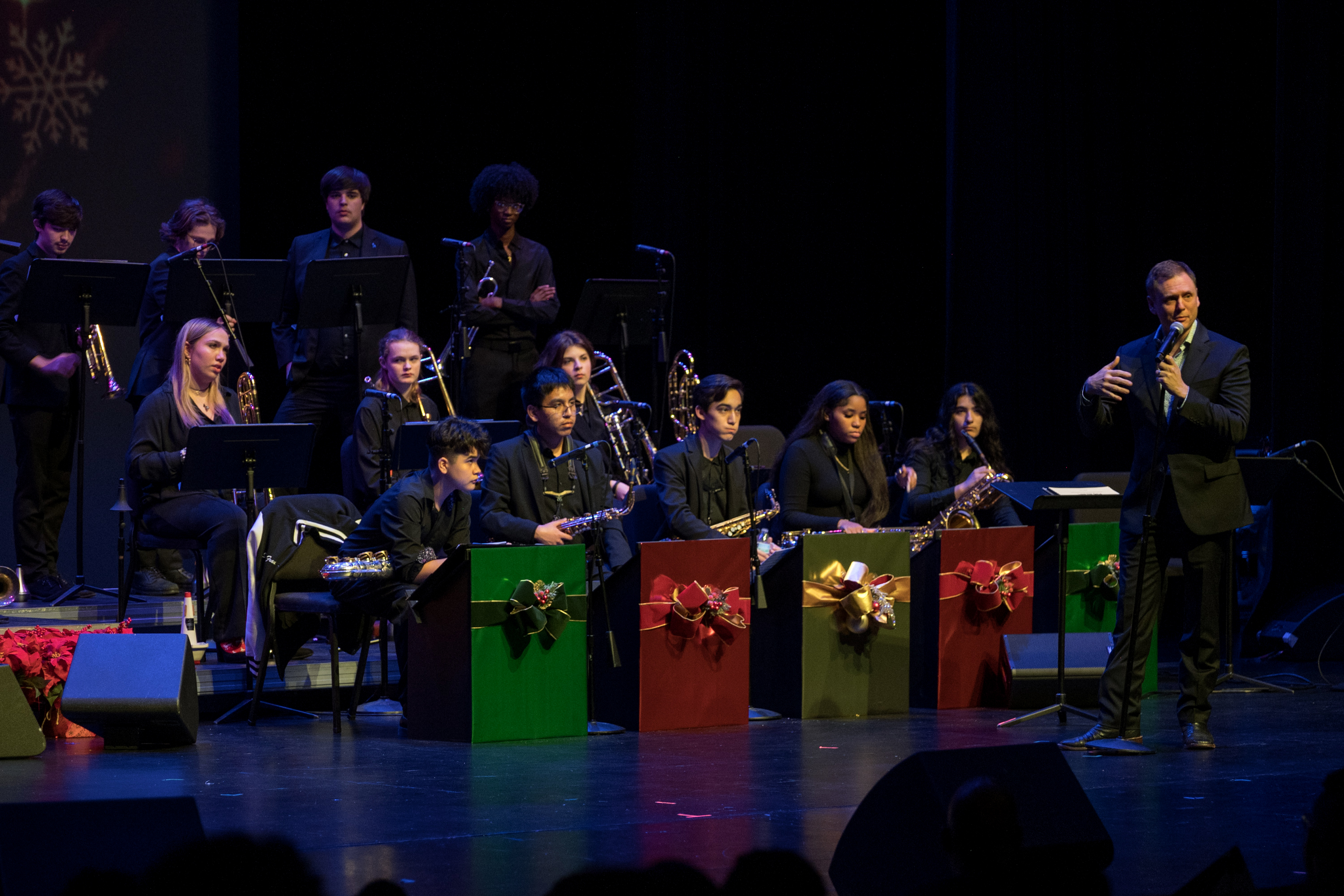 The DocFest 2024 Holiday Concert took place on December 21, 2024, at the Denney Theatre on the Kinder HSPVA campus. Alumna Jeane July served as the Master of Ceremonies for the nearly sold-out event. The program opened with a performance by Stephanie York Blue and her jazz combo, featuring excerpts from her composition, “More Than Christmas.” Part II commenced with the Kinder HSPVA Jazz Ensemble, led by Jazz Director James Westfall. A particularly moving segment followed as Doc Morgan led the ensemble and guest performers—including former students, faculty members, and his nephew—in “A Christmas Trilogy,” a piece written by his father and dedicated to his late brother.